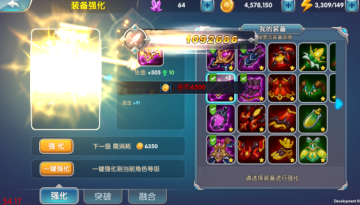 装备强化消耗一定金币对装备进行升级提升,也可一键强化到当前角色等级,还可以进行装备突破和融合相关操作。