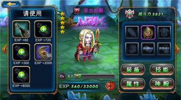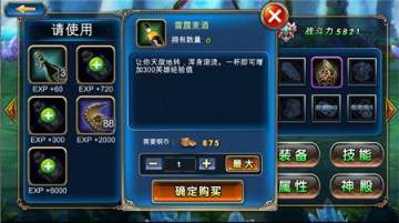 点击经验条后面的加号就可以打开升级的界面。点击拥有的酒就可以增加英雄的经验值,如果拥有的酒不够时,直接点击酒上的加号就可以直接购买。英雄的等级不能超过领主的等级。