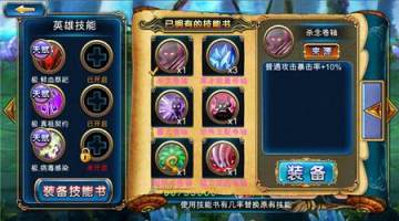 选择【技能】后再点击【装备技能书】按钮就可以打开自由技能书的装备按钮。选择【装备】则会装备自由技能在英雄身上。不过装备的操作有一定概率会随机覆盖英雄已有的自由技能。