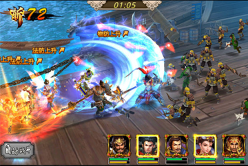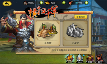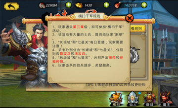 “横扫千军"活动,该活动的核心玩法就是大面积扫兵,真正的体现游戏战斗割草的快感,游戏内会不停的刷新敌兵,玩家通过击杀小兵,获得奖励。玩家斩杀小兵的数据越多,奖励越高。每一个关卡都有自己独立的排行榜,玩家可以看到自己在该关的斩杀小兵的排名。关卡分为“长坂桥和七星关”,共六个难度,长坂坡为物理攻击兵,掉落游戏前期急需的经验药水,七星关为法系攻击和远程兵,掉落游戏前期急需的艺术品,在商场中能转换为银币。