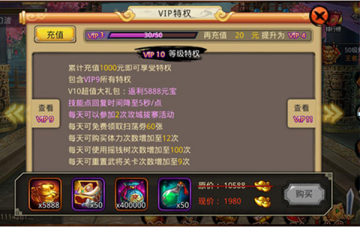 不同等级的VIP有不同的好处,但都是比较丰厚而且绝对物超所值哦!所以适当利用VIP其实是很划算的,对于角色的各方面强大都非常有益。也会让自己在玩游戏的过程中更加轻松,享受贵宾的尊荣!