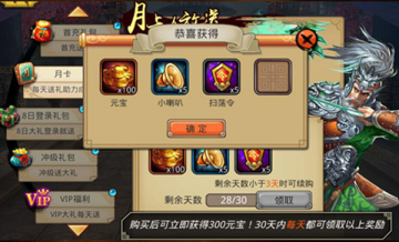 玩家在游戏中充值能获得VIP等级,月卡是《美人如画将无双》目前最划算的功能啦。玩家花30元购买月卡不仅可以立即获得元宝返还,还能立即领取大礼包,并且还能每日获得高额元宝和道具奖励,持续1个月,极大的提高了玩家付费的性价比。有助于玩家有足够的元宝购买升级所需的体力与银币,更快地增强武将的战斗力。此外游戏中还开放了每日充值,累计充值,等各种性价比极高的充值活动,满足各阶层付费玩家的需求。
