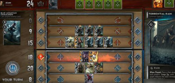 整局游戏大概15分钟,游戏刚开始时玩家有10张牌,玩家必须精心部署自己的卡牌,才能生存。每张卡牌都有战斗值,分为近战、远程、攻城三大类型,同一类型的单位牌要成排放置在战场指定区域中。