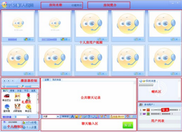 点击社区平台左边操作目录,选择9158十人房,出现“销售专区”“缘分天空”“网通专区”“家族有约”“音乐影视”5个区。选定某个区后,右边主页面出现房间,选中进入房间,便可以进入9158十人房。界面图示如下: