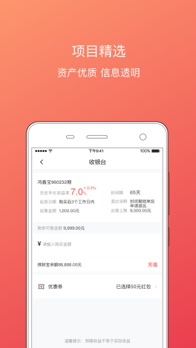 “捞财宝”理财平台中所有理财产品均经过严格筛选,且提供“风险金代偿保障”,如有违约,由平台对投资人优先进行本息垫付,保障投资人的资金安全,让理财人的投资安稳无忧。