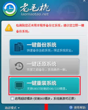 3、备份完毕后重新启动电脑,打开老毛桃一键还原程序即可看到程序自动检测到刚刚备份了系统。以后当系统中毒或是出现其它问题时点击(请在还原之前提前备份好系统盘的个人资料,还原时将对C盘原有数据进行覆盖。)即可将系统恢复到之前备份的状态。