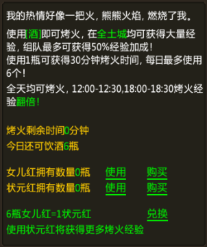 喝酒烤火玩,每天可以使用6个女儿红,全天均可烤火,而烤火的时间选择在12:00--12:30,18:00—18:30喝酒烤火经验翻倍。