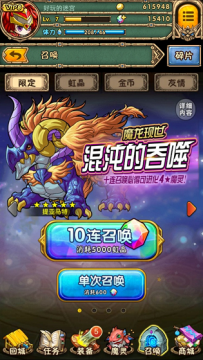 金币召唤可以获得稀有魔灵、强化用魔灵、进化用魔灵、强化石、觉醒石、晶石、扫荡卡、友情点以及稀有素材。每天有5次免费召唤的机会,单次召唤需要消耗2万金币,十连召唤需要消耗10万金币。