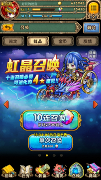 召唤系统分为限定召唤、虹晶召唤、金币召唤和友情召唤。每召唤一次即可获得一个魔灵碎片,魔灵碎片可在商城中的魔灵商城里兑换魔灵。