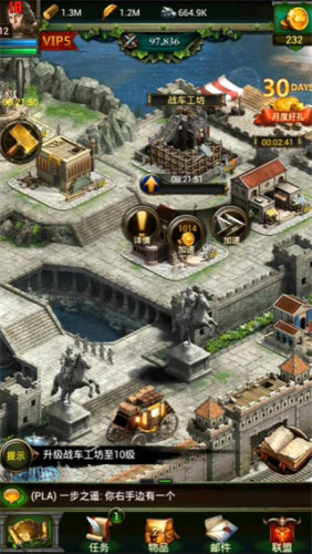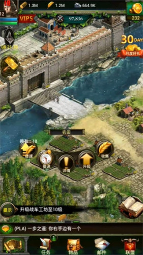 -建造农田、伐木场、铁矿和秘银矿来获得资源并增强你的城市与军队