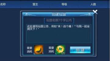 创建仙盟需要消耗一个蚩尤之角和一万金币,公会名字最多可以使用7个字。公会宣言可以由公会会长自由填写。