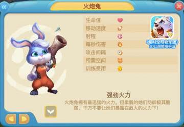 火炮兔军团专配的火炮具有出色的射程,威力也是相当的不俗。很多情况下,火炮兔可以在敌方的射程之外进行进攻,看得到,却打不到,这样的糟糕感觉对敌人的士气也是一种打击。不过,兔子们瘦弱的身躯很难抵挡战火的摧残,所以想要让火炮兔们真正的发挥出火炮的威力,就一定要保护好她们,让她们远离可能被攻击到的区域。针对那些有远距离防御能力的武器,派出坚盾熊部队吸引火力也许是一个很好的选择。