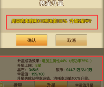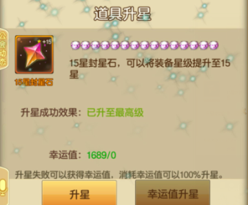 在我们升星过程中,总会有失败的时候,这些失败的升星会累计成幸运值,消耗指定的幸运值可以100%升星。比如:5星的时候用100的幸运值就可以100%升至5星半。楼主在这里建议大家,不到万不得已还不是用幸运值升星吧,这个都用在升15星的,是不是~~