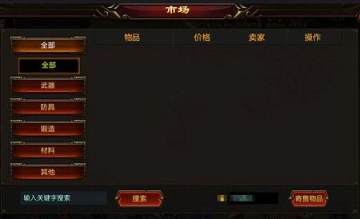 寄售系统中购买界面比较简洁,左边列表是可以交易的物品选项,有武器、防具、锻造、材料、其他五大类。右边是下面是一个搜索框,可以通过关键字来搜索商品,比如你想要查看逍遥的装备,直接输入逍遥,就能查询出相关的装备。下面是展示的物品列表,分别展示物品信息、价格、卖家、这4个类别信息。