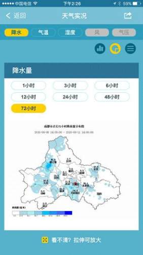 —天气预报:提供成都地区逐6小时天气预报、区县级7天天气预报、五城区24小时天气预报、乡镇级24小时天气预报、短时临近天气预报;