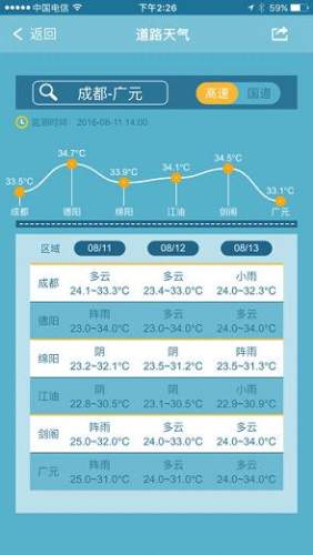 —道路天气:提供成都到四川各地的6条高速公路、9条国道线路的沿途天气实况、3天天气预报信息;