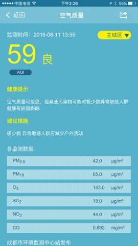—空气质量:提供成都地区实况空气质量、健康提示和建议措施以及3天空气质量预报;