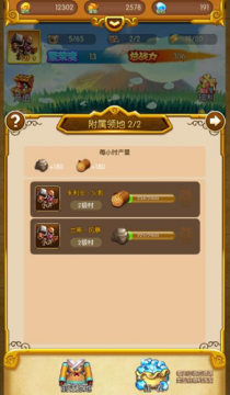 生产是全自动的,每分钟更新一次资源数量,存储于仓库中,玩家可以将界面顶部的仓库栏下拉展开,查看所有资源的储量(如果爆仓了会以红色标识)。即使玩家下线后,资源生产也会自动进行,当再次上线时,就会看到资源产出的结算。领地的百姓,每分每秒都在为您创造着财富哦~