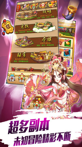 游戏内伙伴角色将三国中耳熟能详的神将与修仙神魔糅合在一起。各个阵营均会有其特色的种族划分,诸如曹操军-妖族、孙权军-仙族等,为玩家呈现了一个光怪陆离的三国时代。