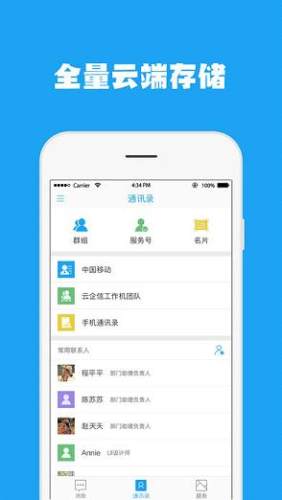 云企信提供企业通讯录、即时消息、多媒体会议、移动办公等服务。为了满足企业个性化需求,云企信还提供能力调用、定制化开发与集成服务。