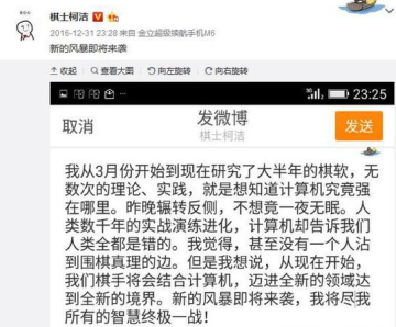 柯洁最近更新了微博,写道:“我从3月份开始到现在研究了大半年围棋软件,无数次理论、实践,就是想知道计算机究竟强在哪里,昨晚辗转反侧,不想竟一夜无眠。人类千年的实战演练进化,计算机却告诉我们,人类全都是错的……我将尽我所有智慧终极一战。”