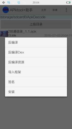 1.你可以按选择工程的按钮进入文件管理界面,找到你生成的 _src 结尾的文件夹后(自动判断为蓝色图标的),点击就可以打开Apktool工程。或者点击自动搜索,将会将/sdcard里的含有 src 的文件夹列出来,点击列表就可以打开。打开后你可以修改软件包名等等一键注入代码什么的~
