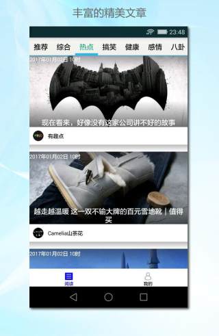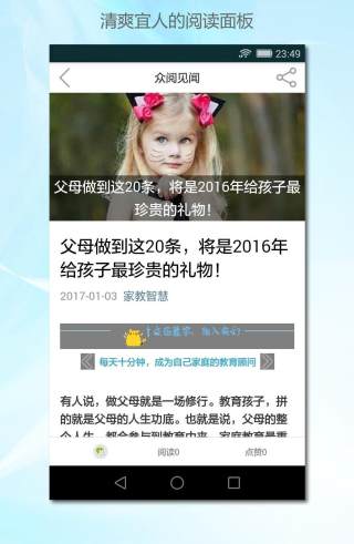 这是一款微信文章阅读app,每天推荐海量热门文章,文章版面清爽宜人,内容引人入胜,值得精读。可与朋友分享阅读体验,收藏精美文章。