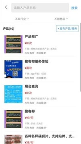 搜客邦是一款非常实用的效率办公软件,软件功能非常强大,软件能够帮助用户通过大数据快速获客,进行用户精准营销,用户还能使用软件发布产品,进行曝光,操作非常简单,有需要的朋友快来下载体验吧!