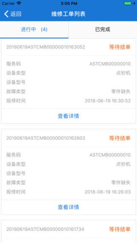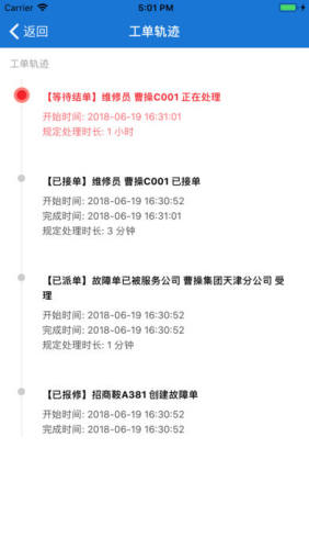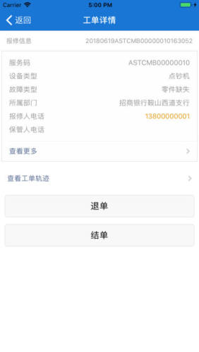 设备维修人员可以方便地通过App进行接单、派单等操作,在维修结束之后可以使用App的结单功能直接填写详细的维修说明。同时,不论是维修人员或管理人员都可以通过App实时对工单状态进行查看,追踪工单动向。
