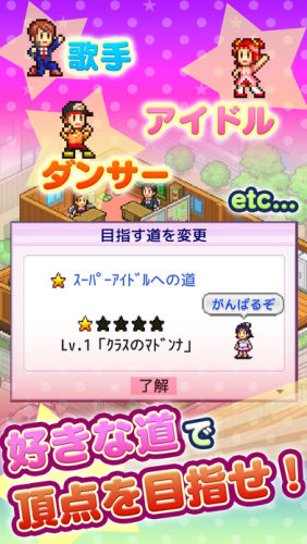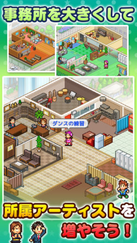 这次开罗游戏为我们带来培养歌星题材的模拟经营新作,玩家将化身成为一个事务所的老总,通过一系列的经营手法挖掘新人,将其培养成一流的歌星,期间玩家可根据歌星的情况进行组建乐队,出席活动,甚至举办全球演唱会,一步一步的成为世界巨星。期间玩家也要根据明星的热度,**周边产品获得更多的利润。 该作的玩法结合了角色养成培养、探险挖掘以及商店经营的玩法。