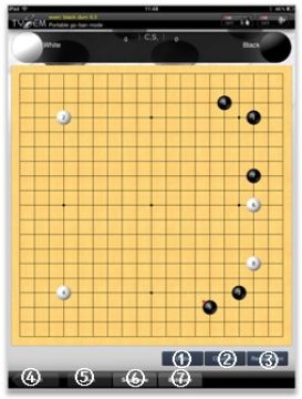 面对面对局界面功能说明:(1)悔棋 (2)数子 (3)认输 (4)退出 (5)再来一盘 (6)显示手数 (7)形势判断