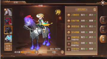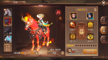 坐骑拥有四个坐骑技能的位置,分别在坐骑等级达到10级、20级、30级、40级时开启,坐骑技能同时可以最多辅助两名不同武将,为其带来属性加成。坐骑技能将随着技能阶数提升而解锁,玩家可通过驯马令提升坐骑的星数从而升阶,坐骑每提升一阶还将获得一次免费修改技能的机会。
