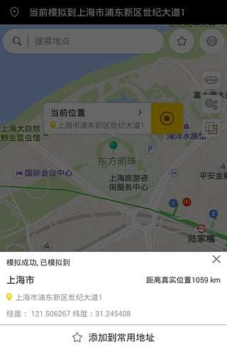 ③打开“天下任我行”,搜索框输入目标地点,例如:北京市朝阳大悦城,然后点击如图所示的播放符号。