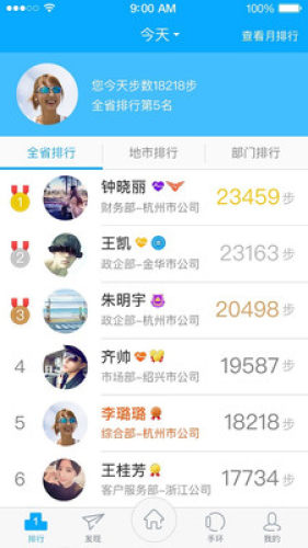 2.排行:查看自己和同事好友在企业各级部门的运动排名情况。