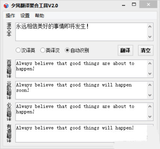 夕风翻译聚合工具将百度、谷歌、必应、有道等翻译软件集合在一起,支持汉译英和英译汉,可自动识别源文本,一键翻译多显示多个软件中的结果。