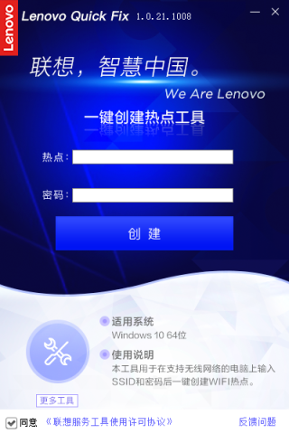 联想一键创建热点工具,联想电脑WiFi热点创建工具,输入热点账号、密码,一键创建,快捷又方便,为用户带来更便捷的热点创建服务,有需要的小伙伴欢迎前来下载体验。