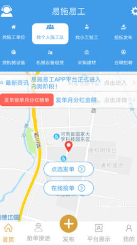 6.就近接单:只要打开抢单接活功能,即可看到附近发布的施工信息,可实时显示接单距离。