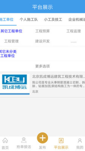 2.建筑施工接单:入驻企业或者个人承接建筑/装修/施工、租赁、供应等工程信息。