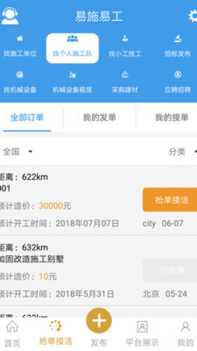 7.抢单接活儿:施工企业、个人劳务施工队、小工技工、机械设备商、建材商只要打开APP就可以接到工程或订单,以后找活不用走关系、东奔西跑,一键抢单支付、接活更省功夫。