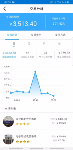 可以显示某一天的历史数据,也可以切换统计目标:现金交易笔数,电子交易笔数,现金交易金额,电子交易金额。