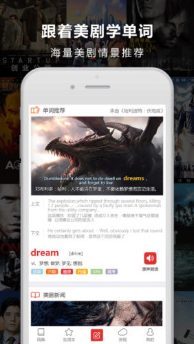 人人词典苹果版支持美剧原声朗读,让单词碎片化刺激大脑消化;这里还能跟着美剧学单词,海量美剧情景推荐更精彩,并且想要的美剧都能在这里查询到哦。
