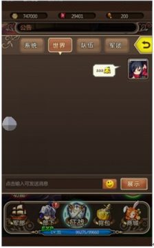 聊天功能里,玩家可以在世界频道,队伍频道或军团频道展开交流互动。
