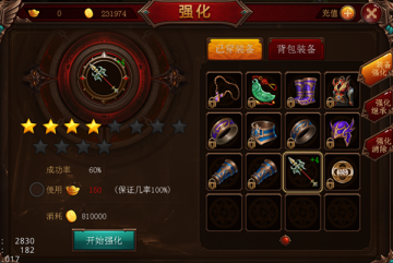 但是,强化等级越高,往上强化的失败率越高(失败只会扣除强化所需的金币费用,不会有其它损失)。因此我们可以选择使用元宝来保证百分百强化成功。