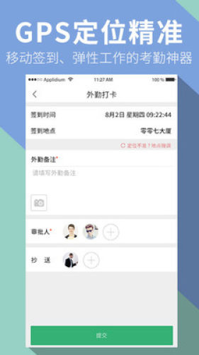 1、支持上下班移动打卡、外出考勤定位签到