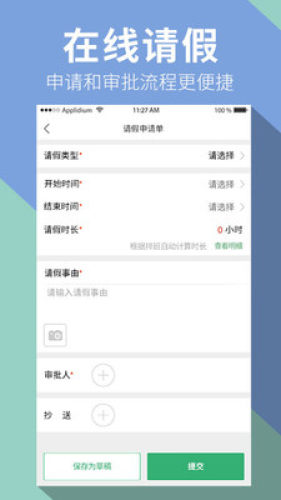 3、实时发起在线请假、补打卡及审批功能