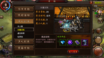 试炼妖塔是个小型的单人副本,每天可以进入3次,点击右上角“目标”--“单人副本”--“封魔试炼”即可进入试练塔。