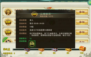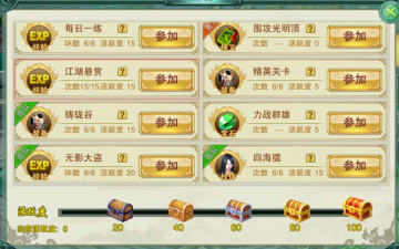 参加江湖悬赏,小编告诉大侠一个密秘。此副本是单人战斗。当然,福利也一揽手中。每日15次机会获取大时经验,增加15活跃度。另外包打听经营副本,发下江湖悬赏令。大侠可接取红榜,完成悬赏,获取相应经验与金钱奖励。