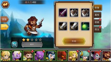 英雄的阶级分为:白色、绿色、绿色+1、蓝色、蓝色+1、蓝色+2、紫色、紫色+1、紫色+2、紫色+3、紫色+4、橙共12个阶级