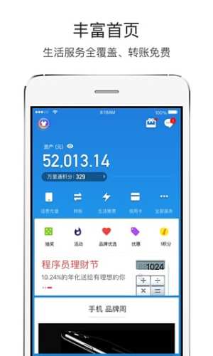 目前服务涵盖:理财、生活便民、购物、转账还款、保险五大板块。