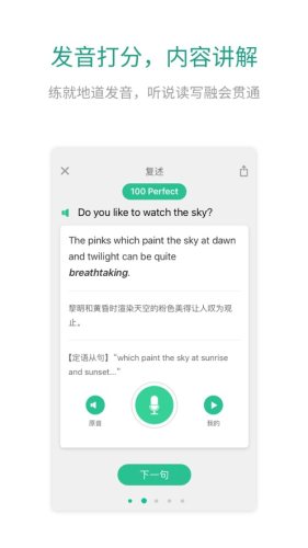 英语口语、单词和听力全面提升是扇贝口语的独到之处。拒绝单一跟读模式。提前预习重点词汇,事半功倍。跟读模仿阶段智能打分,纠正发音错误。提供逐句中文翻译。听音复述,不给文本,完全凭借记忆(对,就是要虐)。还可以将你的发音分享给朋友,学习路上不孤单。